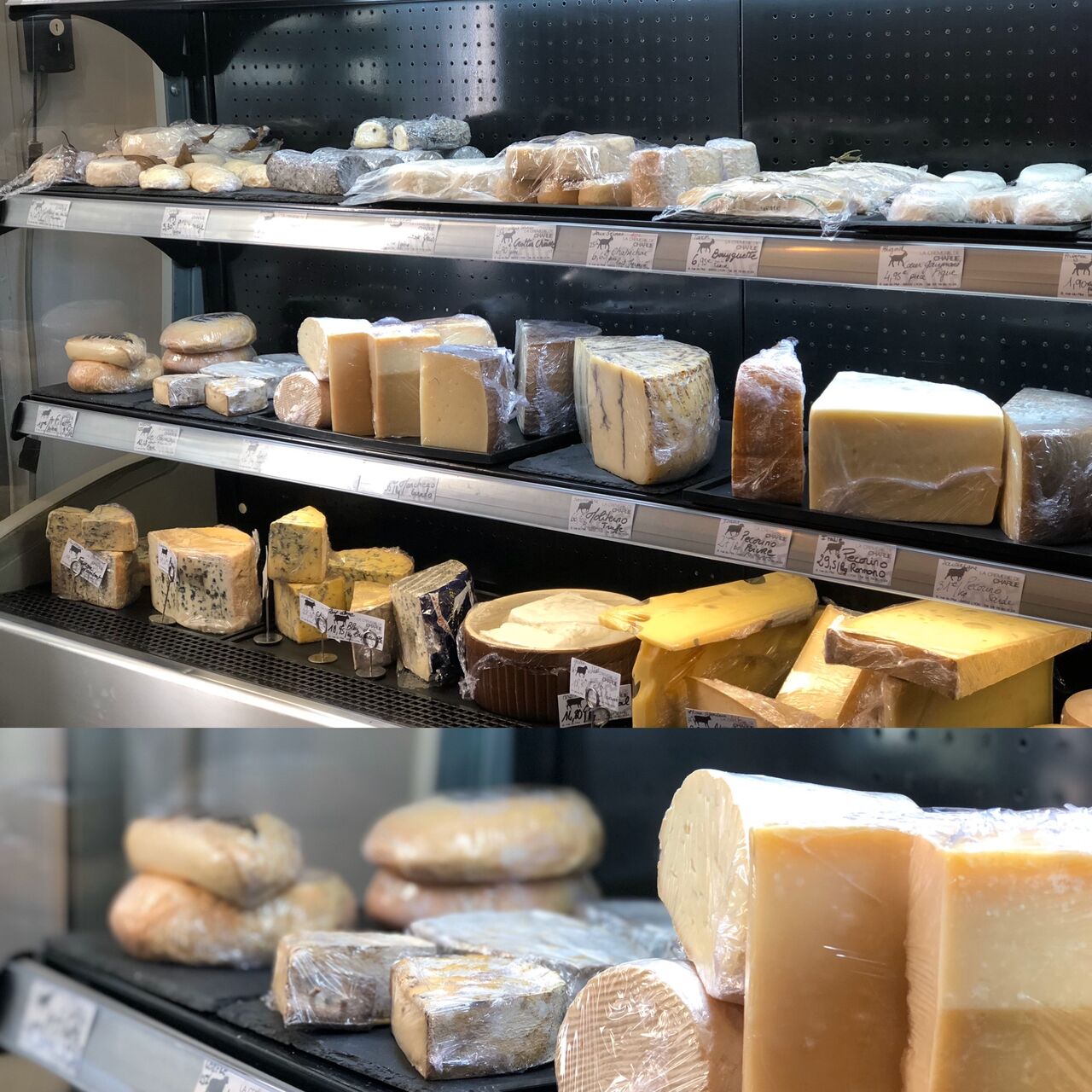 Se mêlent alors dans cette ambiance d'inox et d'ardoise, les couleurs excentriques des Gouda et des Cheddar, les croûtes vieillies des Gruyère d'Alpage et des tommes de Savoie, les fromages de chèvre, de brebis et de bufflonne... Rien de compliqué!